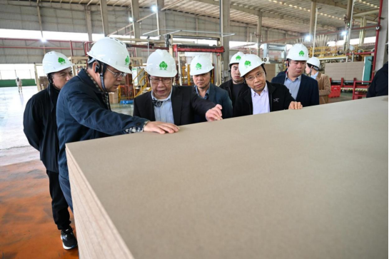 11月19日下午,调研组赴广西丰林木业集团股份有限公司,深入调研其高端人造板生产基地与技术创新成果。在南宁人造板工厂,调研组察看德国迪芬巴赫等国际顶尖设备运行情况,详细了解中国第一条超强刨花板生产线的产能规模、产品标准及市场应用场景。